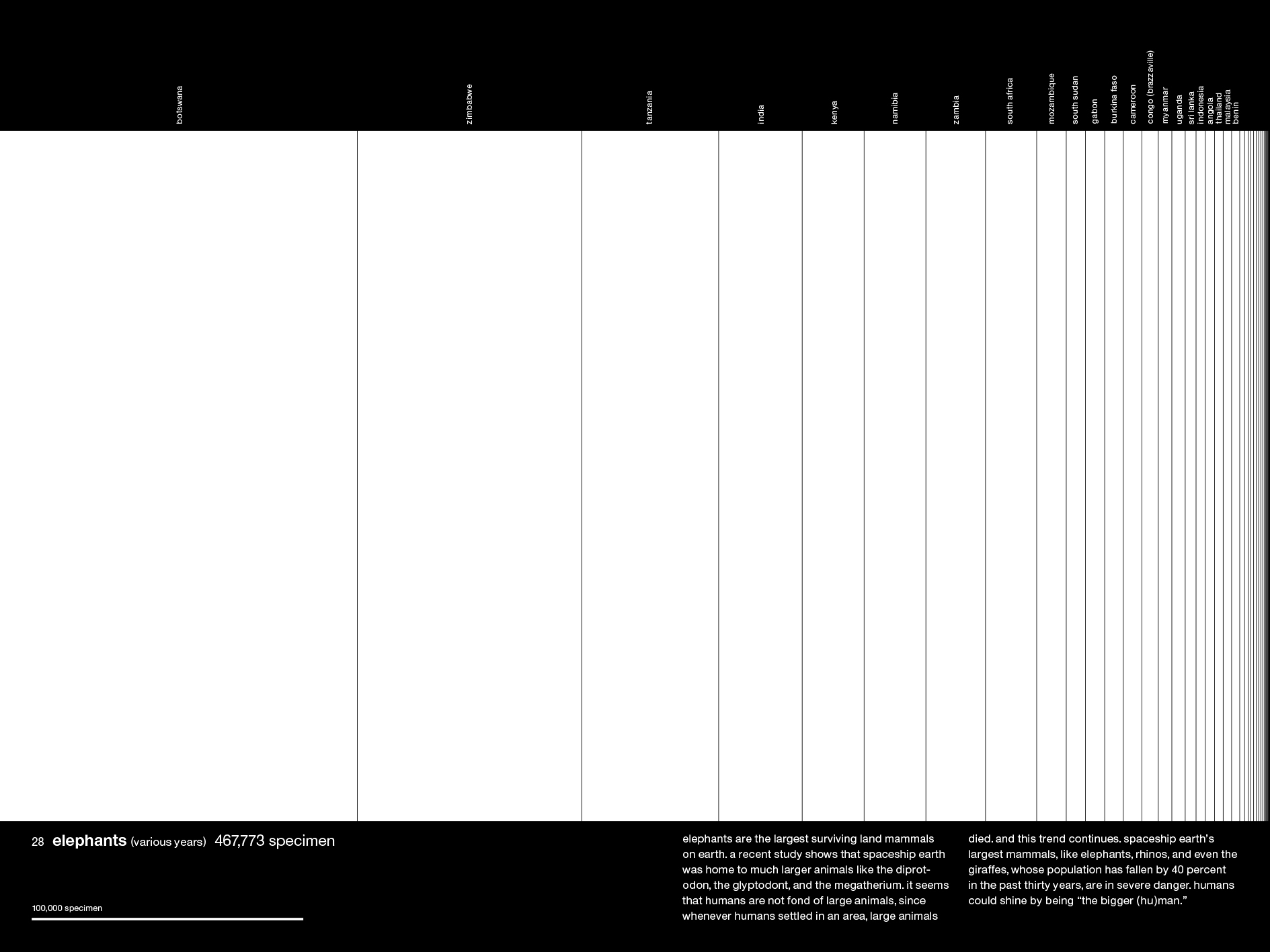 Breaking down planet earth into 12 sections, the book gives a page spread to information pertaining to themes like ethnic groups, religions, nuclear warheads, and number of motor vehicles per country. The white pages of the book are divided by vertical black lines, in decreasing percentages from left to right.